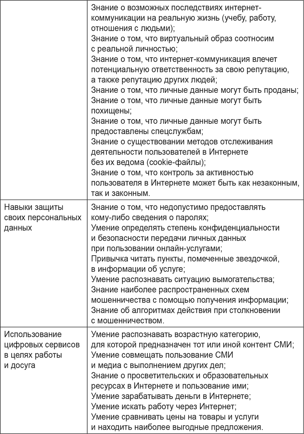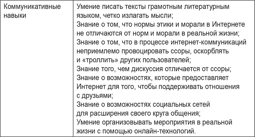 Составлено по: Цифровое будущее. Каталог навыков медиа- и информационной грамотности. – М.: МЦБС, 2013; Цифровая компетентность подростков и родителей. Результаты всероссийского исследования / Г. У. Солдатова, Т. А. Нестик, Е. И. Рассказова, Е. Ю. Зотова. – М.: Фонд Развития Интернет, 2013.