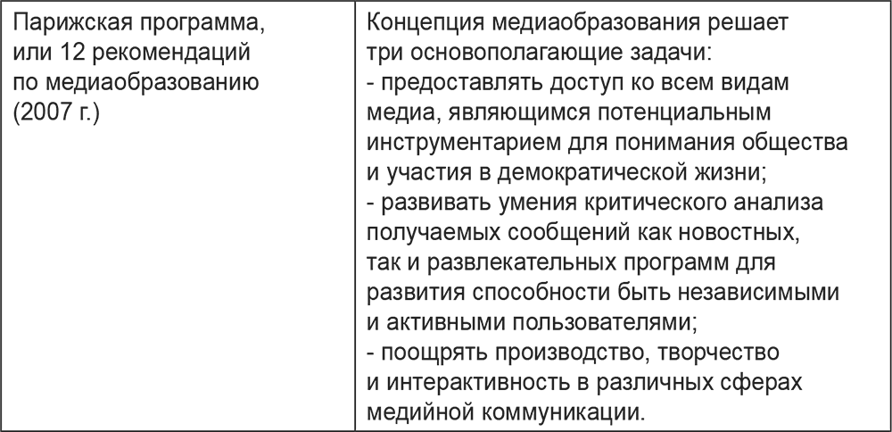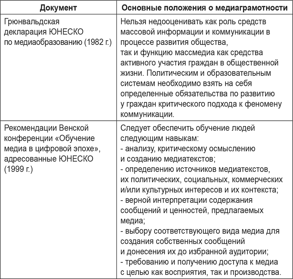 ЮНЕСКО, Совет Европы и другие международные организации неоднократно обращали внимание на просвещение и образование в сфере СМИ (см. табл. 3). Традиционные подходы к медиаобразованию менялись со временем[3]. Так, в 1970 гг. медиаобразование приобрело политический аспект, считалось, что на СМИ лежит ответственность за формирование политических взглядов. В 1980-1990 гг. главной стала защита детей (в Великобритании бытовало мнение, что средства массовой информации представляют «низкую» культуру, и могут разрушить ценности культуры «высокой», в США существовали опасения, что СМИ могут привить детям неприемлемые ценности и поведение). В начале XXI века акценты сместились в сторону развития творческих навыков и умений активной аудитории, особенно востребованных в условиях цифровой революции.