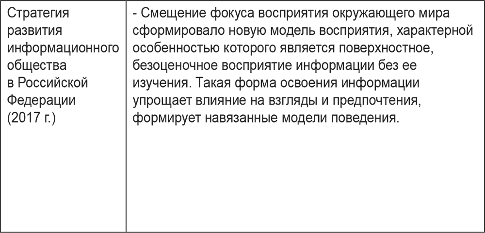 Медиаобразование по природе – и «позитивное» и «негативное» регулирование. С одной стороны, это формирование определенных запретов и рамок, а с другой – максимальное развитие творческих способностей детей. Во многом это идеалистический взгляд, но без формирования новых правил жизни в Интернете мы не сможем справиться с угрозами цифровой среды. Именно поэтому концепция медиаобразования очень часто пересекается с концепцией информационной безопасности (см. табл. 4). Российский путь регулирования информации направлен на защиту пользователя, прежде всего ребенка, от угроз и опасностей новой коммуникационной среды.