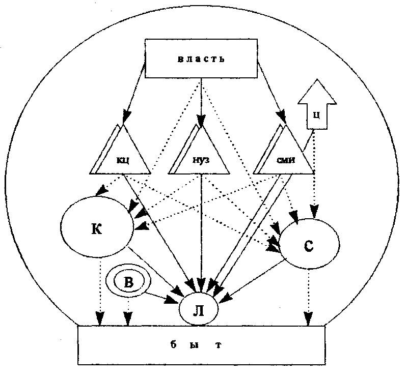Обладая определёнными функциями (семь функций перечислено на схеме), она влияет на быт и сознание граждан. Именно власти поручено проявлять заботу об общем благе. Она создаёт культурные ценности и удовлетворяет основные потребности народонаселения. Кроме того, имея в своём распоряжении средства массовой информации (СМИ), культурные центры (КЦ) и научно-учебные заведения (НУЗ) формирует сознание людей. Власть обязана иметь общенародную концепцию воспитания.