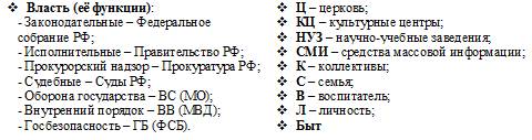 6. ЦЕРКОВЬ – сюда я отношу все религиозные конфессии, находящиеся в данном государстве. Церковь обязана хранить и развивать веру у людей и распространять высокие нравственные заповеди, данные людям Великими Иерархами и пророками. Для этого церковь должна сама являться носительницей своей веры, а служители культа – показывать непререкаемый пример веры, высокой нравственности и культуры. Религиозная убеждённость людей кардинальным образом меняла их отношение к жизни, как в лучшую, так и в худшую сторону, о чём свидетельствуют факты истории.