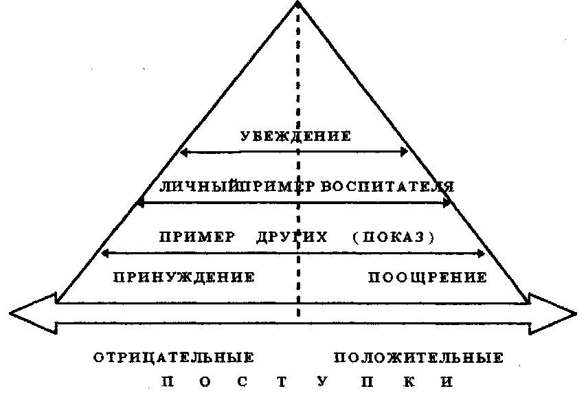 Любой человек, от президента и до простого гражданина, если имеет подчинённых, всегда хочет найти способы воздействия на них для того, чтобы руководить, обучать и воспитывать их. Эти способы очень разнообразны, но все они подходят под нашу схему. Давайте рассмотрим все методы воспитания «снизу-вверх»: Первые самые низшие из них расположены на схеме прямо над поступками – методы «кнута и пряника».