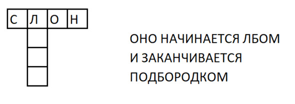 Петя написал слово СЛОН в клеточках, и тогда гном снова взялся за дело. Он дорисовал от второй клеточки, где появилась буква Л, еще три клеточки вниз, одну под другой. И написал рядом «Оно начинается лбом и заканчивается подбородком»