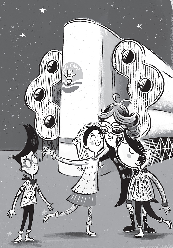 ‘This is where I leave you,’ said Mrs Zinkerman, checking her phone. ‘Ralphie, Regina, come over and give me a kiss goodbye.’ She leaned down and Ralph and Regina dutifully kissed her on the cheek. ‘Farewell, my dear space explorers! I can’t wait to hear all about your intergalactic adventures!’