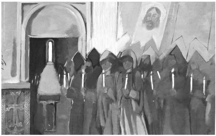 Нина добровольно взяла на себя роль экскурсовода. Тогда собралась группа молодых художников и музыкантов из России, приехавших на молодёжный фестиваль. Гостям предложили обычный туристический маршрут – Гарни, Эребуни, Эчмиадзин. Свозили их и в более отдалённые места. Михаила поразила старая, полуразрушенная часовня с тремя ступеньками. К ней вела узкая тропинка, ограниченная с обеих сторон развалинами когда-то мощных стен. И вокруг только скалы, отливающие фиолетовым цветом, небо и небогатая, но яркая растительность. Зелёный, голубой и фиолетовый – всего три цвета, но как богато играли они!