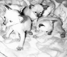 Сиамские котята рождаются на свет белоснежными, с розовыми носами и подушечками лап, и только через несколько недель у них начинает проявляться характерный пятнистый рисунок. Под воздействием низких температур шерсть котят приобретает более темный оттенок, и чем ниже температура окружающей среды, тем темнее оказывается окрас сиамской кошки.