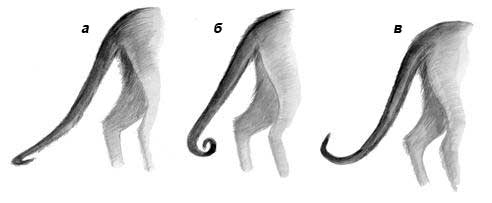 Изломы хвостов сиамских кошек: а – хвост крючком; б – хвост, загнутый кольцом; в – хвост с двойным изломом