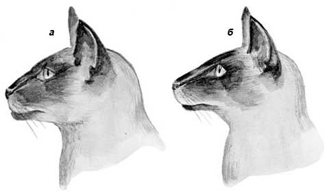 Строение челюстей сиамской кошки: а – правильное строение челюстей; б – недокус