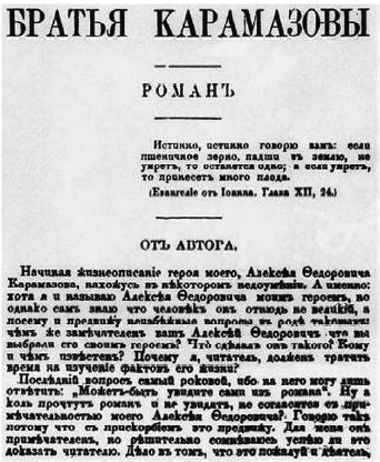Все свои крупные романы, начиная с «Преступления и наказания», Достоевский публиковал в журнале М. Н. Каткова «Русский вестник». Но так получилось, что «Подросток», предшествующий «Братьям Карамазовым», по инициативе Н. А. Некрасова появился на страницах демократических «Отечественных записок». Последний роман был еще до написания первых глав обещан снова в катковский журнал (после смерти Некрасова о продолжении сотрудничества с «03» и речи быть не могло) и за него, как всегда, был получен писателем аванс. В письме от 11 июля 1878 г. к С. А. Юрьеву, который предлагал ему отдать новый роман в задуманный им журнал (будущая «Русская мысль»), Достоевский, обещая подумать, сообщил интересные подробности о методах своей писательской работы, уникальных для литературы вообще и русской литературы XIX в. в частности: «Роман я начал и пишу, но он далеко не докончен, он только что начат. И всегда у меня так было: я начинаю длинный роман (NB. Форма моих романов 40–45 листов) с середины лета и довожу его почти до половины к новому году, когда обыкновенно является в том или другом журнале, с января, первая часть. Затем печатаю роман с некоторыми перерывами в том журнале, весь год до декабря включительно, и всегда кончаю в том году, в котором началось печатание. До сих пор еще не было примера перенесения романа в другой год издания…»