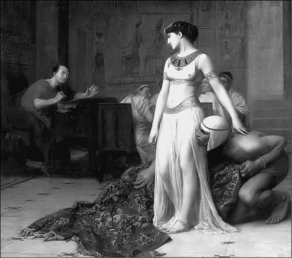 В то время могущественный римский завоеватель Юлий Цезарь (100—44 гг. до н. э.) прибыл в Египет и потребовал от молодых правителей возвращения огромных долгов, которые оставил после своей смерти их отец. Ни Птолемей XIII, ни Клеопатра возвращать долги не собирались, а в голове у девушки сразу же родилась хитроумная идея. В тот же вечер, облачившись в самые красивые наряды, она приказала слугам завернуть ее в ковер и принести в подарок Цезарю. Вечером царица подарила себя римскому полководцу, а наутро праздновала победу. Римлянин влюбился в юную Клеопатру и пообещал не только простить ей долги, но и заставить ее брата примириться с сестрой.