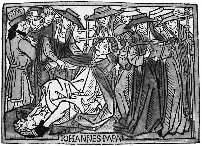 20 ноября 857 года папа Иоанн VIII совершал крестный ход. Папессе было настолько трудно, что она едва переставляла ноги, поддерживаемая двумя кардиналами. Процессия направлялась к центральному собору, чтобы там совершить молебен. Идти сама женщина уже не могла. У нее начинались роды. В этот момент разразилась гроза, и сквозь ужасный гром люди услышали крики страдающей в муках женщины. Собравшейся на площади толпе предстала ужасная картина: на земле лежал окровавленный папа, а рядом кричал только что родившийся младенец.