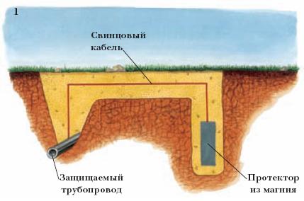 1 – с «жертвенным» анодом-протектором (в этом случае происходит постепенное разрушение анода, а металл трубопровода коррозии не подвергается);