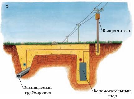 2 – со вспомогательным анодом и внешним источником тока (в этом случае защита осуществляется за счёт расходования электроэнергии)