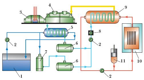 1 – источник водоснабжения; 2 – насос; 3 – генератор; 4 – паровая турбина; 5 – конденсатор; 6 – деаэраторы; 7 – очиститель; 8 – клапан; 9 – теплообменник; 10 – реактор; 11 – регулятор давления