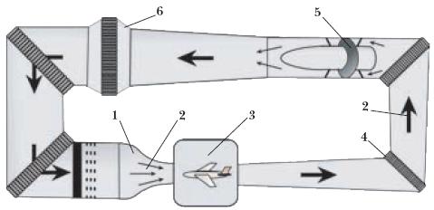 1 – конфузор (для дополнительного ускорения воздушного потока); 2 – направление воздушного потока; 3 – рабочая часть с моделью; 4 – колено с поворотными лопатками (для устранения завихрений воздушного потока); 5 – компрессор; 6 – воздухоохладитель