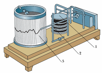 1 – анероидные коробки; 2 – перо; 3 – барабан с бумажной лентой, приводимый в движение часовым механизмом