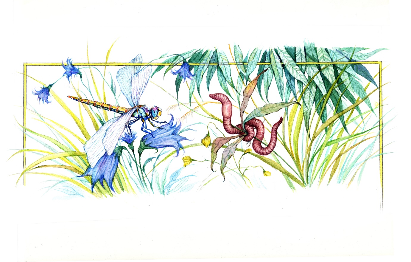 Стрекоза села на цветок колокольчика, ожидая, что же будет дальше. А червяк забрался высоко-высоко, на самый конец травинки, и теперь хитро извиваясь, неуклюже растопыривал листики в стороны.