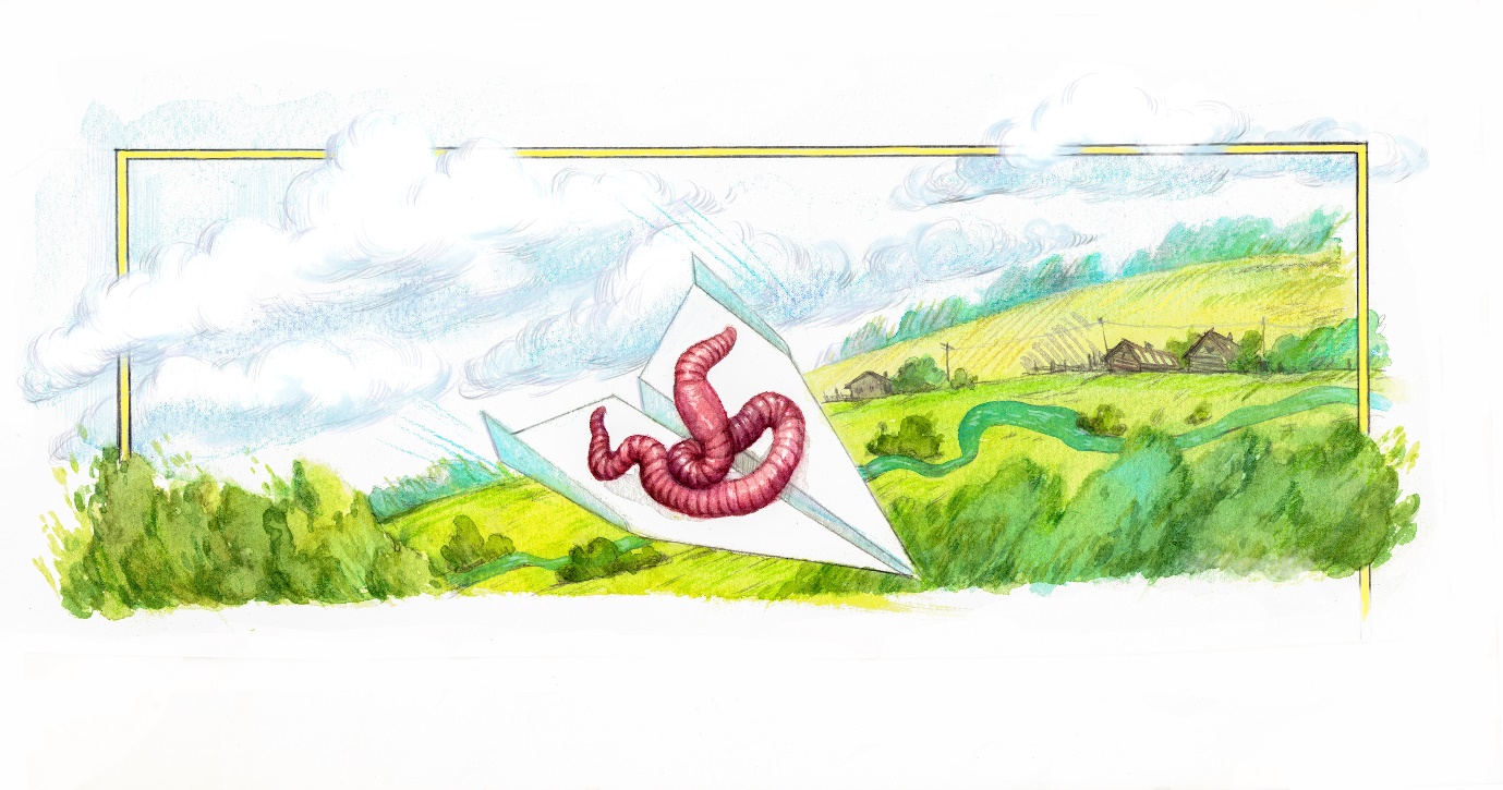 Когда он открыл глаза, то увидел, как земля, трава и цветы с бешеной скоростью несутся на него. От страха Червия подался назад, и самолетик, задрав нос, устремился вверх. Наклоняя бумажные крылья, Червяк научился управлять самолетиком. Страх отступил, глаза Червяка горели восторгом, сердца бешено бились. Мимо мелькали деревья, дома, птицы. Девочка Лисана махала рукой с балкона, приветствуя свой самолётик, и громко смеялась. Скоро ветер утих, и полет стал легким. Самолетик больше не прыгал по воздуху, а плавно скользил между небом и землей. Счастливый пилот Червяк уверенно летел в лучах вечернего солнца навстречу своей мечте.