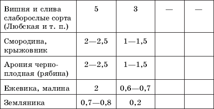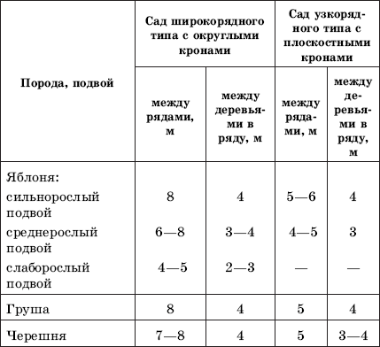 Практикуется высаживать деревья с расстоянием между рядами 4–5 м. В этом случае у деревьев формируются плоскостно-вертикальные кроны. Ширина таких крон поперек сада – 1,5–2,5 м (уже вверху и шире внизу). Такой способ формирования кроны деревьев нуждается в ежегодной обрезке для ограничения размеров дерева, особенно его высоты и ширины в верхней части кроны. В табл. 1 приведены расстояния между плодовыми растениями в любительском саду.