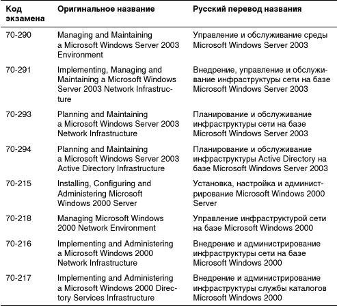 Компания Microsoft имеет развитую систему сертификации специалистов по всем основным технологиям и системам, разработанным этой компанией. В табл. В1 представлен список экзаменов по серверным операционным системам.