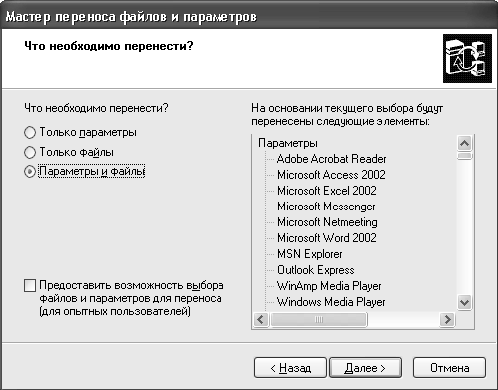 □ приложения. Возможность перенести на новую систему параметры приложений, таких как Winamp, Acrobat Reader, приложений Microsoft Office и др.