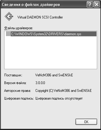 На рис. 2.2 показан список драйверов, имеющих цифровую подпись Microsoft. На рис. 2.3 приведен пример неподписанного файла драйвера.