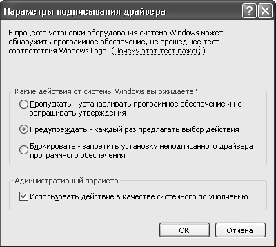 По умолчанию переключатель установлен в положение Предупреждать – каждый раз предлагать выбор действия (Warn – Prompt me each time to choose an action). Если выбран этот параметр, то перед установкой неподписанного драйвера Windows ХР Professional выводит предупреждение и предлагает сделать выбор, продолжать установку или нет.