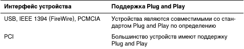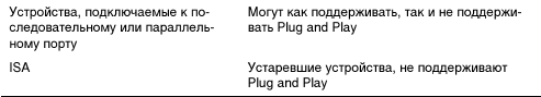 Таблица 2.3. Поддержка стандарта Plug and Plat устройствами различного типа