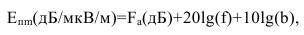 Подставляя в формулу (23) вместо Fa(дБ) значения Fппm и Fпgm, а затем переводя в (мкВ/м) по формуле (24) вычисляем медианные значения напряженности электрического поля промышленных и галактических помех Eппm и Eпgm в точке приема для эквивалентной антенны.