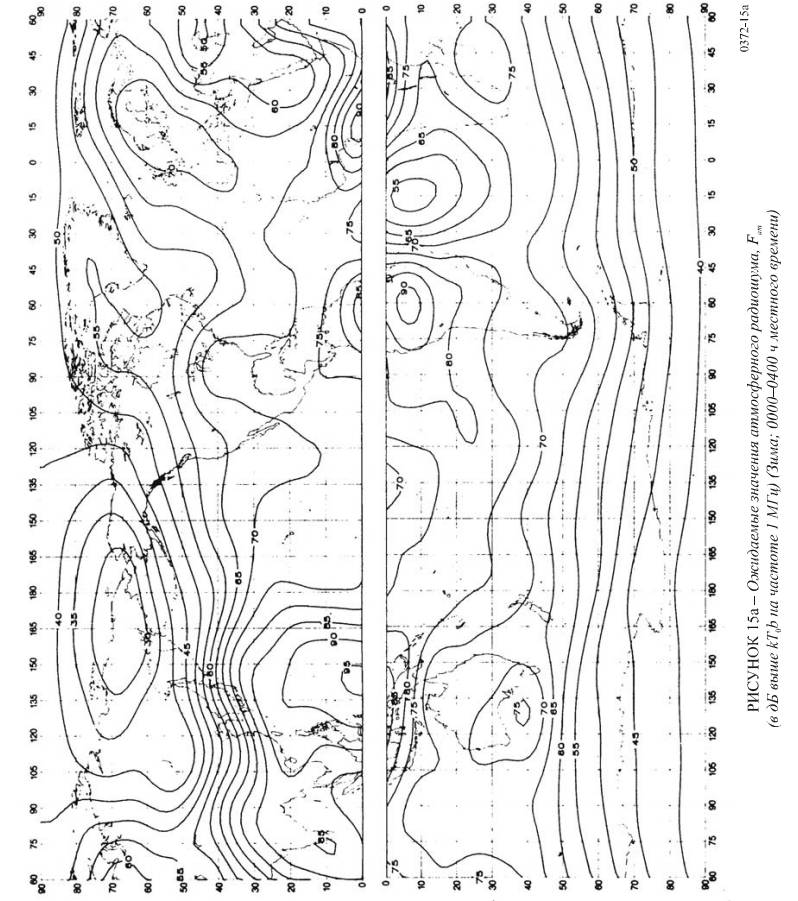 В рекомендациях МСЭ-R P.372-9 [3] на рис. 15а – 38а изображены карты мира, на которых приведены ожидаемые медианные значения коэффициента фоновых атмосферных радиошумов Fam(дБ) выше kT0b, на частоте 1 МГц для каждого времени года при 4-часовых временных блоках, время местное, где: