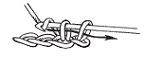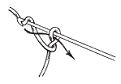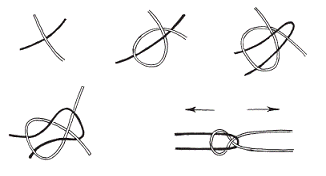 Конец нити 1 придерживают большим и указательным пальцами левой руки. Конец нити 2 берут правой рукой и подкладывают под нить 1, образуя букву «Х», зажимая обе нити большим и указательным пальцами левой руки. Правой рукой нитью 2, идущей к мотку, свободно оборачивают большой палец правой руки, подводят под конец нити 2 и накладывают на конец нити 1 (в их перекрестье). Конец нити 1 вводят в образовавшуюся на большом пальце левой руки петлю, правой рукой затягивают нить 2 так, чтобы петля от нее находилась у большого пальца левой руки (в противном случае узел развяжется).