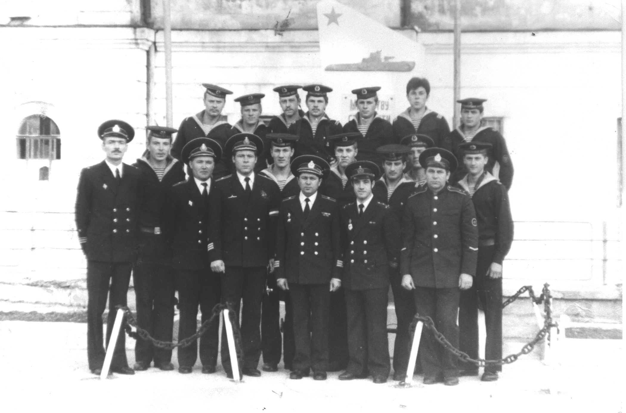 Экипаж С-53 в период ремонта в СРЗ-13. Первый ряд (слева направо): штурман старший лейтенант Олег Фадеев, командир БЧ-5 капитан 3 ранга Алексей Рудь, командир ПЛ капитан 3 ранга Владимир Аникин, замполит капитан 3 ранга Борис Миних, начальник РТС капитан-лейтенант Александр Даниленко, старшина команды машинистов трюмных мичман Николай Басанец