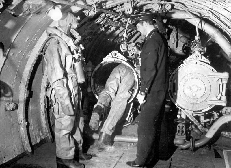 Непосвященному человеку, пожалуй, трудно представить себя на месте подводника в полном спасательном снаряжении и тем более в тесной трубе торпедного аппарата. Подводник в зажгутованном спасательном гидрокомбинезоне («СГП»), с одетым на шею индивидуальным дыхательным аппаратом («ИДА-59») и в свободном пространстве передвигается с трудом. Немало усилий нужно приложить, чтобы забраться в этом снаряжении в сухой торпедный аппарат. Закрывается задняя крышка аппарата и начинается процесс превращения молодых ребят в мужчин.