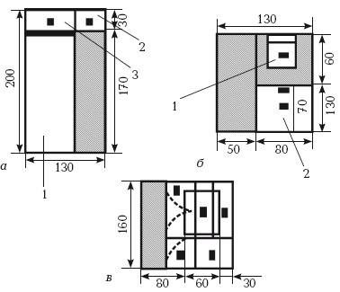 Рис. 1. Функциональные зоны бытового процесса: а) зона сна: 1 – кровать; 2 – тумба; 3 – шкаф; б) зона занятий: 1 – компьютерный стол; 2 – стол; в) зона хранения