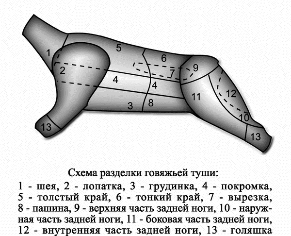 РАЗДЕЛКА ГОВЯЖЬЕЙ ТУШИРазделка мяса состоит из следующих операций: разруба на отдельные части, обвалки частей (отделения мякоти от костей), жиловки и зачистки частей (удаления сухожилий, пленок, хрящей). Основным назначением разруба и обвалки является получение частей мяса, различных по своим кулинарным качествам.