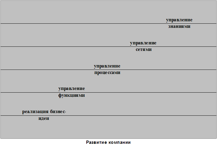 Теория рассматривает развитие бизнеса как системы обоюдного удовлетворения потребностей собственника и потребителя непосредственно вследствие переоценки ожидаемого от данной системы. На фазе управления реализацией бизнес-идеи является важной задача рентабельного увеличения объемов продаж. Внимание собственника в основном зациклено непосредственно на продукте, а основным его мотивом является желание продать его. На этой фазе основным является не превышение ценой потребительной ценности, а управление качеством, которое сводится к его поддержанию на уровне сформировавшихся представлений потребителя. В данной ситуации контроль над качеством сводится к поддержанию уже сформировавшегося уровня. Недостающие навыки, знания и умения могут быть получены на рынке труда непосредственно руководителем какого либо предприятия в период фазы управления функциями. У собственника имеется персонал, но все тем же, как и раньше основным его мотивом является желание обладать. Именно на данной фазе впервые появляются задачи аутсорсинга, но связаны они только, лишь с недостатком некоторых навыков и умений или определенных активов. Предположим, что фирма, занимающаяся производством молочной продукции приобретает услуги рекламной компании, т. е… производственное предприятие приобретает непрофильные услуги изготовления рекламной продукции – это так же является непосредственно аутсорсингом, так как предприятие платит за отсутствие должной базы.
