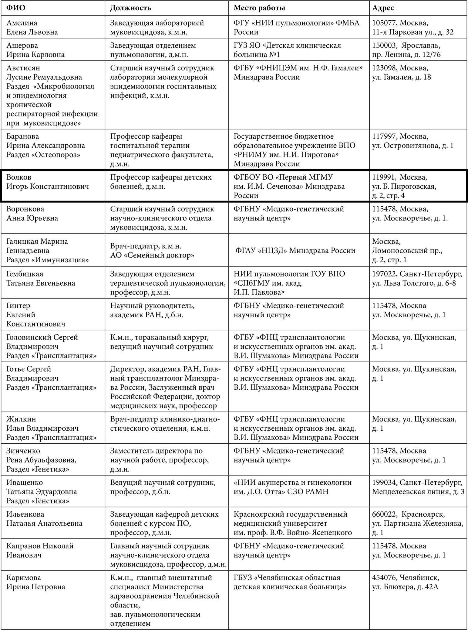 Координаторы проекта в лице проф. Е.И. Кондратьевой, проф. Н.Ю. Каширской, проф. Н.И. Капранова выражают искреннюю признательность всем членам экспертого совета за их высококвалифицированную и трудоемкую работу и надеются, что разработанный Консенсус будет полезен для повседневной деятельности как специалистов, вовлеченных в изучение проблемы муковисцидоза, так и широкого круга педиатров, терапевтов, генетиков, пульмонологов, гастроэнтерологов и других врачей, оказывающих практическую помощь больным данного контингента.
