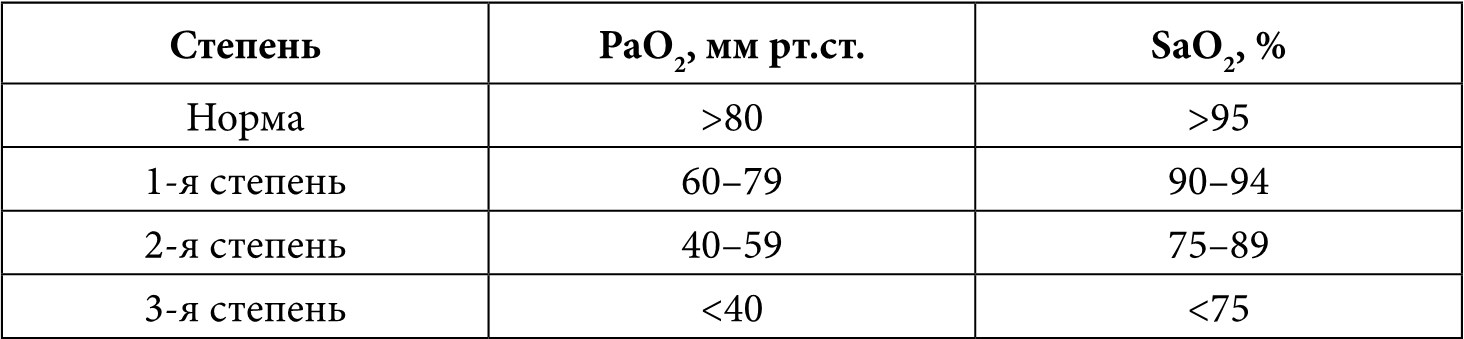 Для оценки характеристики бронхолегочных изменений используют степень дыхательной недостаточности согласно «Классификации дыхательной недостаточности» (Национальное руководство по болезням органов дыхания, 2010). Дыхательная недостаточность (ДН) – неспособность системы дыхания обеспечить нормальный газовый состав артериальной крови. ДН – патологический синдром, при котором парциальное напряжение кислорода в артериальной крови менее 80 мм рт.ст. и/или парциальное напряжение углекислого газа – более 45 мм рт.ст.