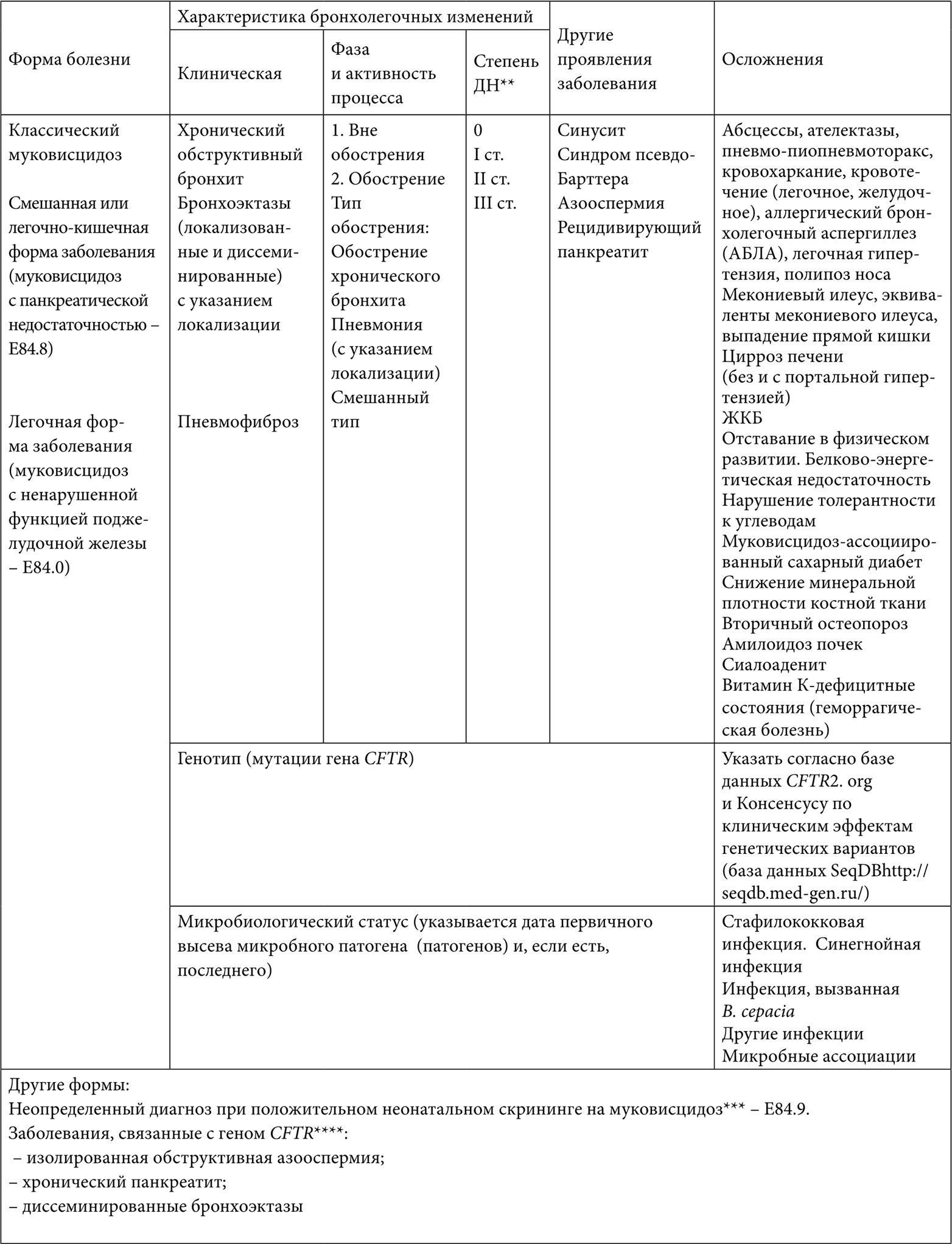 С учетом накопленного в стране опыта по классификации заболевания (Рабочая классификация муковисцидоза (Рачинский С.В., Капранов Н.И., 2000) и рекомендаций ВОЗ и Европейской ассоциации муковисцидоза, а также положений Приказа Минтруда России от 05.07.2016 № 346н «О внесении изменений в классификации и критерии, используемые при осуществлении медико-социальной экспертизы граждан федеральными государственными учреждениями медико-социальной экспертизы, утвержденные Приказом Министерства труда и социальной защиты Российской Федерации от 17 декабря 2015 г. № 1024н» (зарегистрирован в Минюсте России 28.07.2016 г. № 43018), рекомендовано использовать дополнительные показатели для формулировки диагноза (Таблица «Клиническая классификация муковисцидоза»).