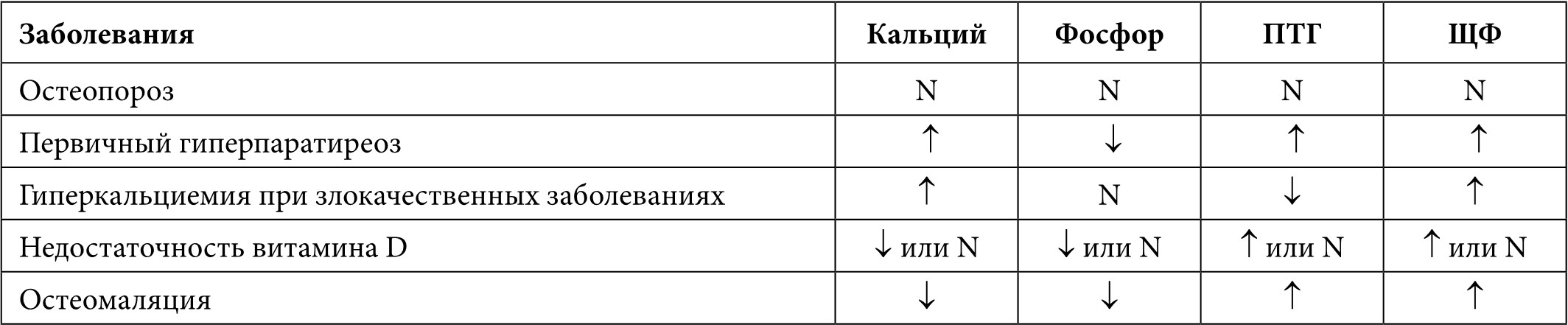 Изменения лабораторных показателей, в том числе маркеров костного обмена, не являются критериями постановки диагноза остеопороза. Лабораторные методы используются для проведения дифференциальной диагностики остеопороза с другими заболеваниями скелета (Табл. 1), оценки безопасности назначения антиостеопоротических препаратов, анализа процессов формирования и резорбции костной ткани.