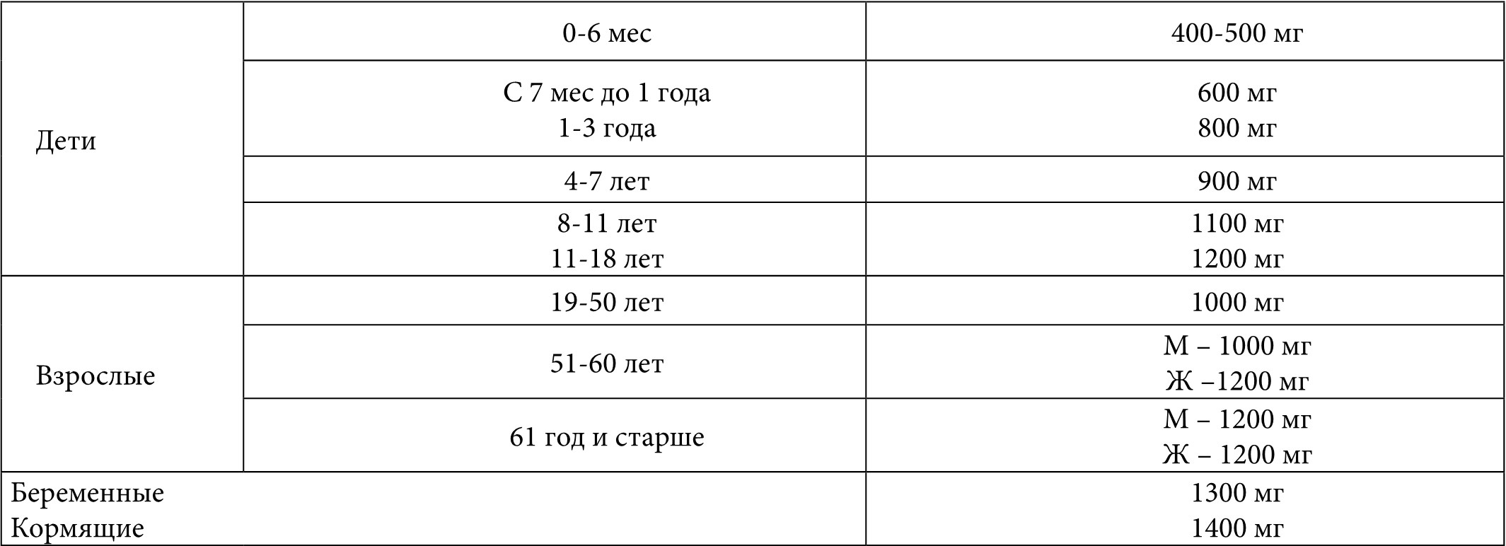 Таблица 2. Суточные нормы потребления кальция [23, 24]