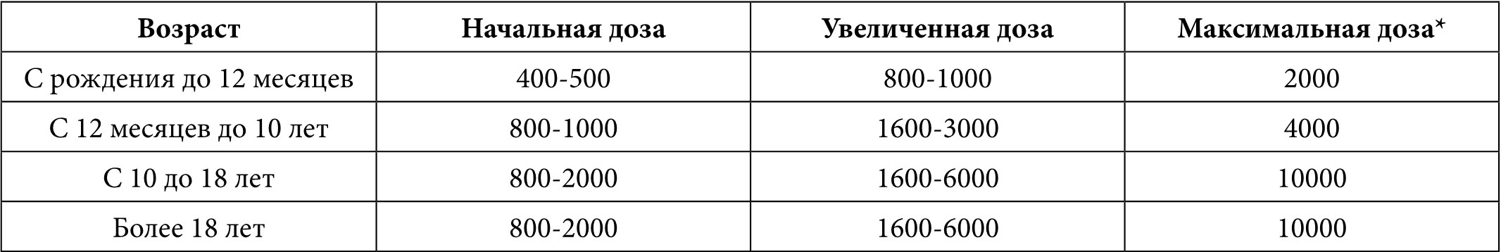 У детей в возрасте от 10 лет и взрослых начальная доза витамина D3 составляет 800-2000 МЕ/сут. При уровне 25(ОН)D сыворотки крови: