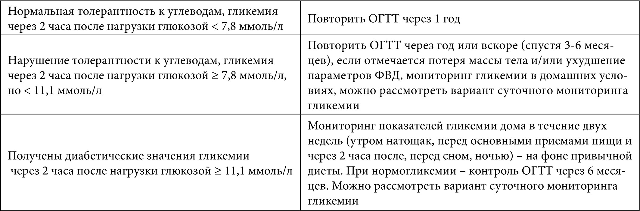 Таблица 2. Варианты наблюдения пациента в зависимости от результатов ОГТТ [3]