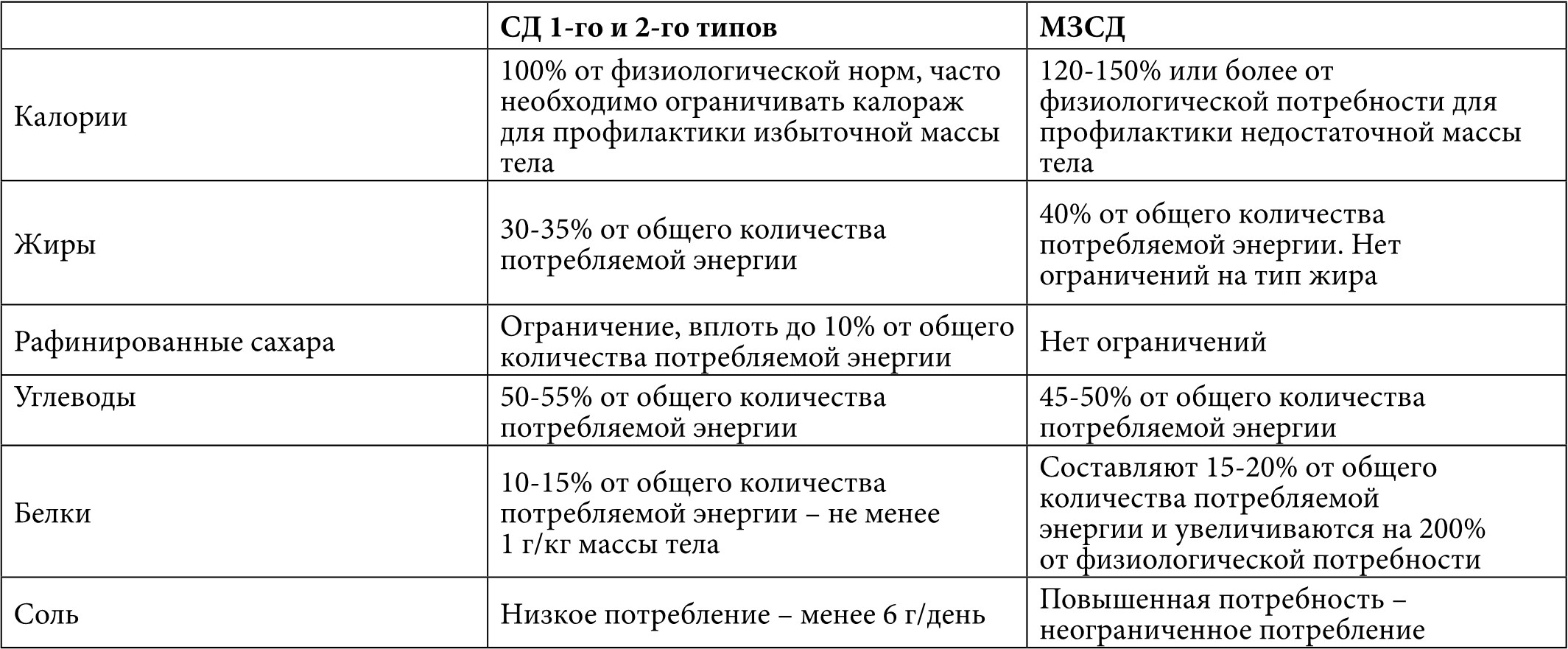 Диета при муковисцидозе гиперкалорийная, с увеличенной квотой жира в рационе, что противоречит диетологическим рекомендациям при сахарном диабете (Табл. 3). Но вопрос решается в пользу основного заболевания – муковисцидоза.