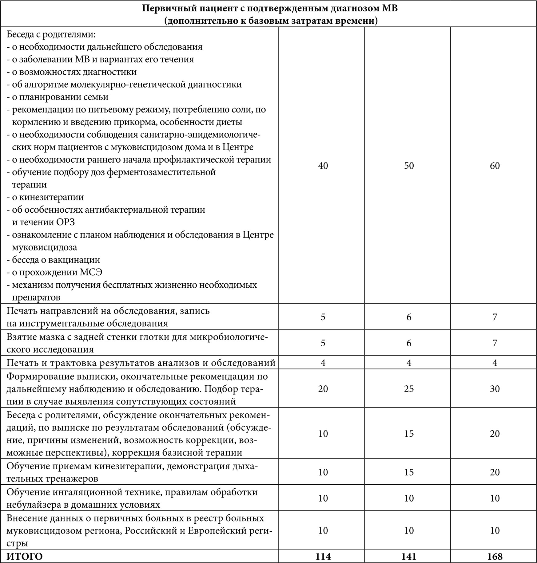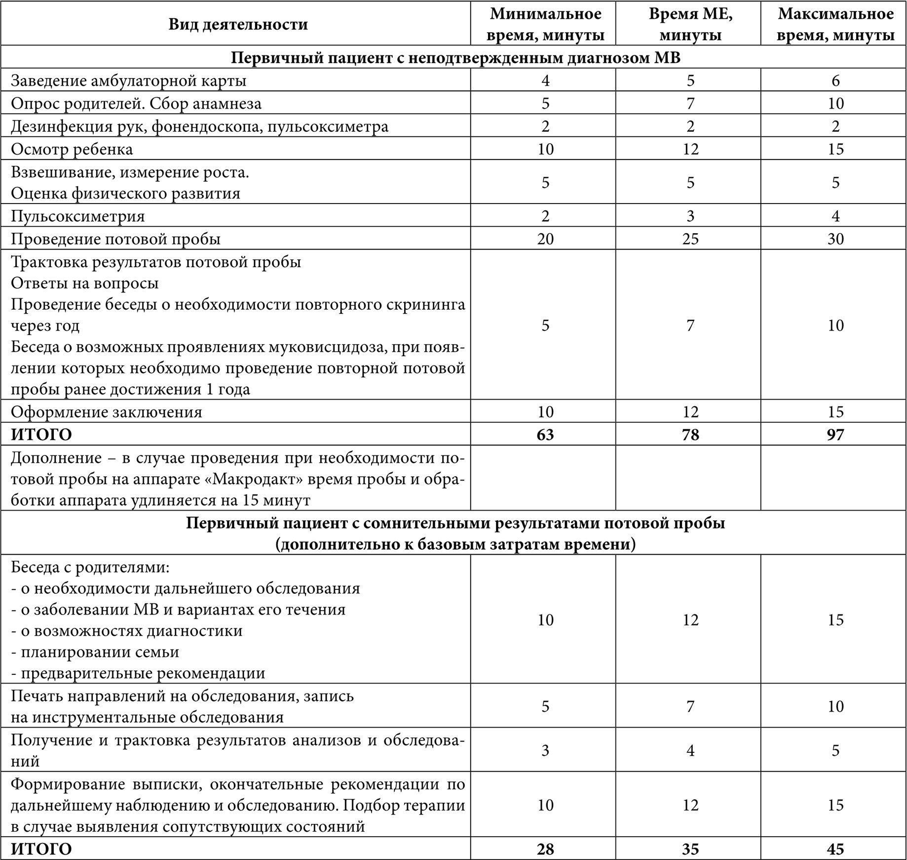 ИТОГО: Первичный ребенок по скринингу с проведением потовой пробы с первой попытки и неподтвержденным диагнозом МВ, отсутствием необходимости дополнительного обследования – минимум 63 минуты (при отсутствии технических сложностей). Первичный ребенок по скринингу с проведением потовой пробы с первой попытки, подтвержденным диагнозом МВ – минимум 177 минут (при отсутствии технических сложностей).