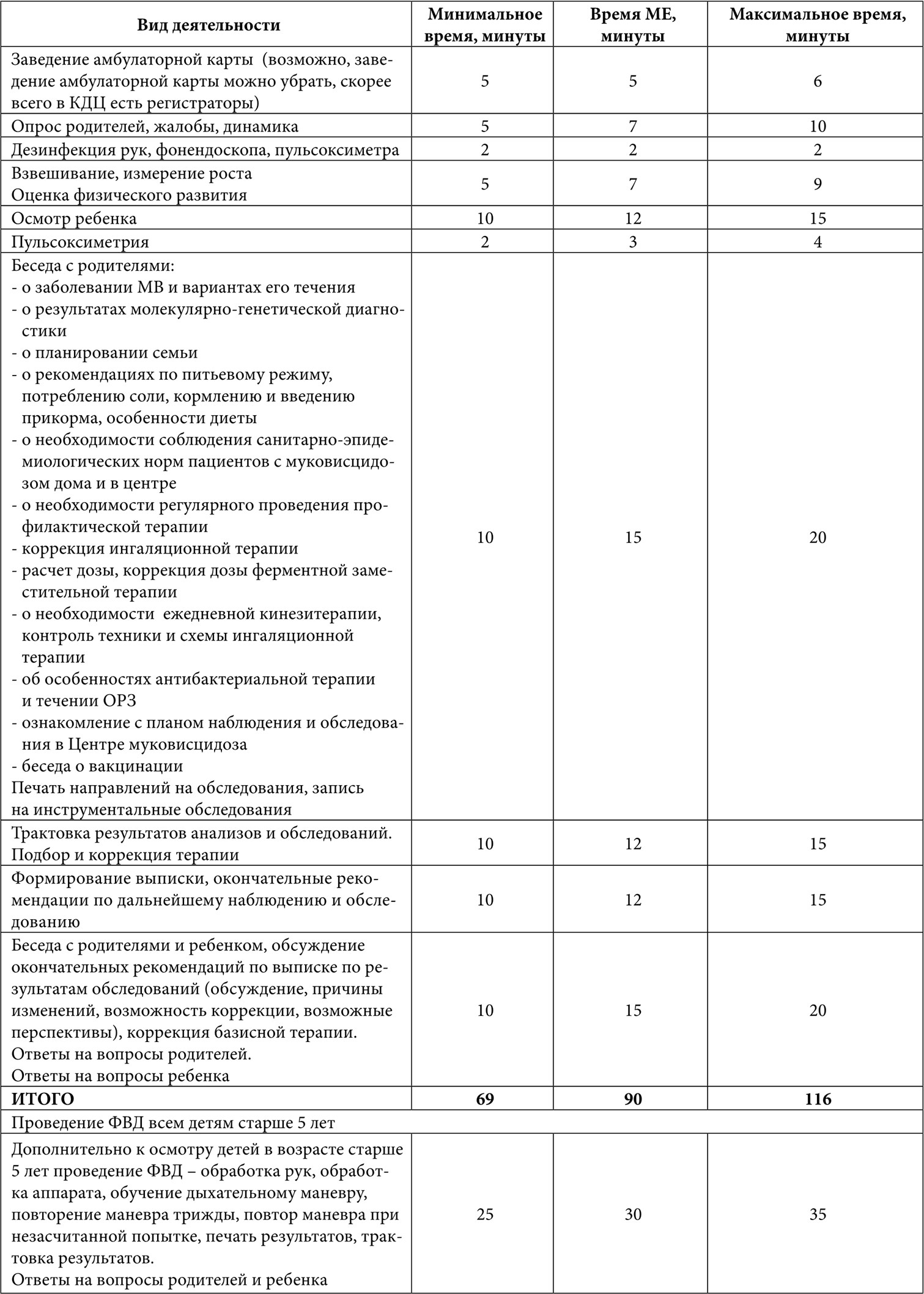 Между приемами пациентов требуются проветривание кабинетов, обработка кушеток, горизонтальных поверхностей, дверных ручек и т.д. дезинфицирующими растворами – занимает не менее 5 минут. Ребенок с муковисцидозом наблюдается 1 раз в 3 месяца, по показаниям – чаще. Ребенок с муковисцидозом на первом году жизни наблюдается в Центре муковисцидоза ежемесячно (минимум 10-12 приемов в год), по показаниям – чаще.