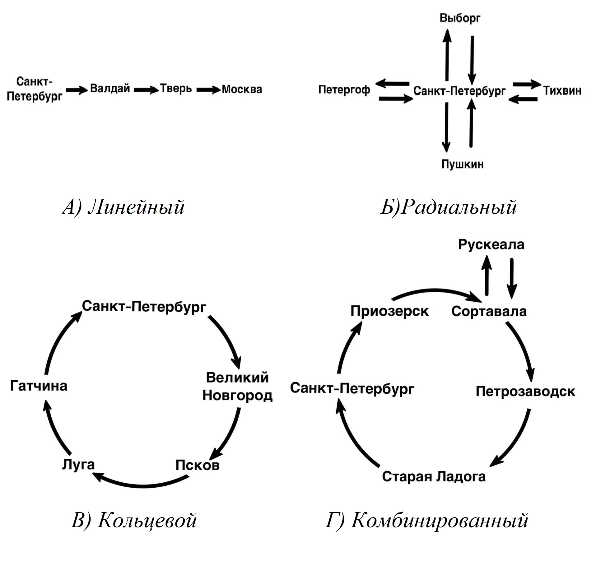 Исходя из классической типологии маршруты могут различаться по последовательности передвижения (Рис.1):