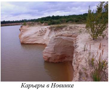 В поселке Новинка располагаются пять карьеров, цвет воды в которых отличается, несмотря на близкое расположение. Вода синего, зеленого, голубого и изумрудного цветов, а также чистые песчаные пляжи, привлекают любителей отдыха на природе. Однако, необходимо соблюдать правила осторожности, так как карьеры в Новинке все еще разрабатываются и потому имеют вязкое дно. Для того, чтобы песчаные карьеры стали полностью безопасны, должно пройти порядка 15-20 лет после окончания разработки.