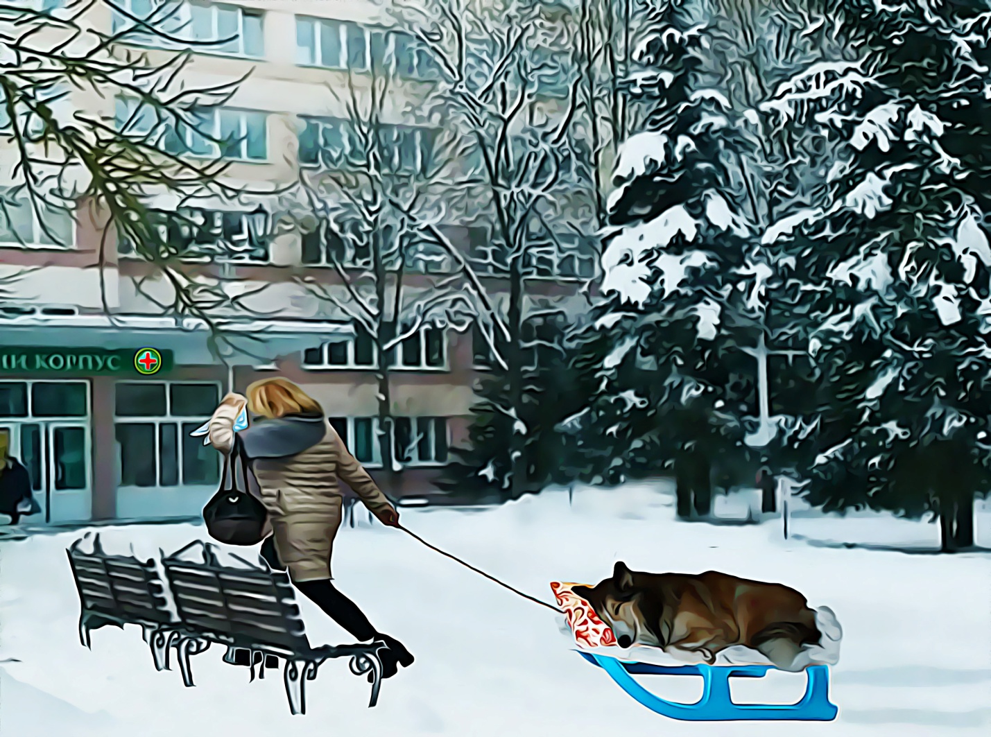 Спина потом с неделю болела, на спине спать не мог. А всё же мы, собаки, так устроены, что мстить совсем не умеем, даже зла не держим. В первую же ночь привиделся мне целительный, душераздирающий сон. Снилось мне, будто лежу я на санях, весь такой раненый и перебинтованный, а в санки запряжена, как в собачью упряжку, продавщица эта мясная. Тянет она кожаные ремни, упирается со всей моченьки. А пурга страшная такая, словно мы в Антарктиде какой или в Арктике. Дорогу совсем замело, от снежных вихрей вокруг ничегошеньки не видать. Тащит бедная продавщица санки, а снежная крупа ей прямо в лицо бьёт, чуть ли не с ног сшибает.