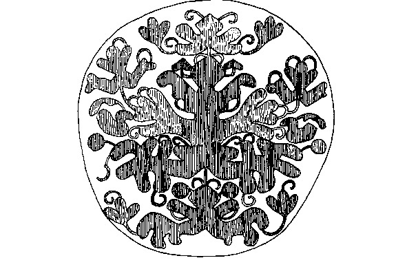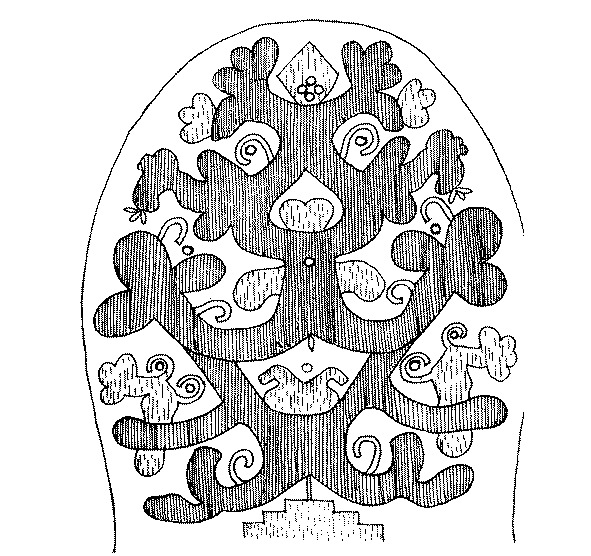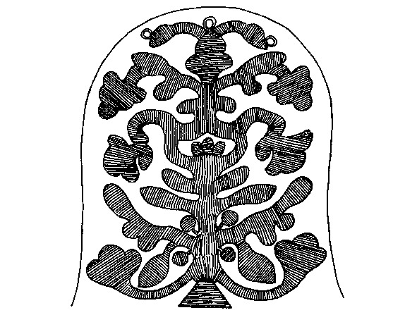 Здесь на «четверти» малинового штофа представлено очень странное изображение древа, составленное из различных условных звериных и растительных форм. Венчают его в верхней части две направленные в разные стороны головки на длинных шеях, очень напоминающие змеиные; ветви дерева удивительно похожи на стилизованные опущенные вниз руки-лапы. И особенно интересна нижняя часть этого своеобразного дерева: две резко выгнутые и поднятые вверх ветки-лапы, на редкость похожие по очертаниям на ноги существа, вышитого на ранее описанном повойнике. Между этими ногами-ветками помещена вытянутая треугольная форма, вырастающая из тела-древа.